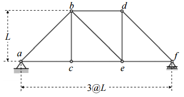 【已刪除】一、試繪下圖所示桁架 ab、bc 及 be 桿之桿力影響線圖(influence line)。已知各桿彈性 係數 E、斷面積 A 值均相同,長度 L=6m。(25 分)
