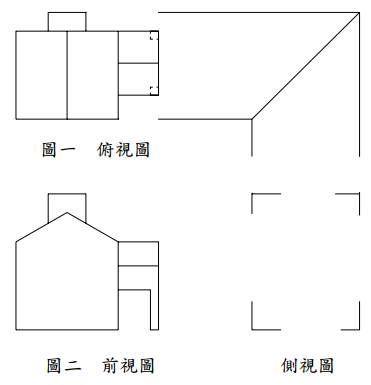 【已刪除】四、試依下列三視圖(圖三)之條件,繪製一消點透視圖。(20 分) 注意:繪圖時各項尺寸,請由圖三直接量測。