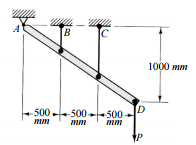 【已刪除】一、有一剛性桿件(rigid bar)AD,端點 A 以銷頭支撐(pin support),桿身另有兩處 分別由兩根線彈性(linear elastic)金屬線支撐至 B,C 兩點。至 B 點的金屬線,其 斷面積為 60 mm