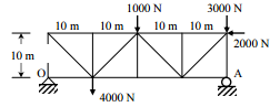 【已刪除】三、有一長方形構架(Truss)系統,其外力負荷如圖所示。構架高度為 10 m,寬度為 40 m。當此構架系統於平衡時,求解支點 O 與 A 的反作用力。(25 分) (注意:O 點的 x 與 y 方向都有反作用力,A 點只有 y 方向有反作用力)
