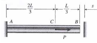 【已刪除】四、如下圖所示,一桿件 AB 長度為 L,其軸向剛度(axial rigidity)為 EA,固定於 A 端, B 端與一固定表面間存在一空隙 s,如圖所示。一負載 P 作用於桿件 C 點上,若 A、B 兩端產生之反作用力大小相等,試求空隙 s 之大小。(20 分)