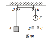 【已刪除】四、如圖四所示,A、B、C 三物體質量分別為 30 kg、20 kg 與 10 kg,滑輪(D、E 為靜 滑輪,F 為動滑輪)質量不計,摩擦力亦不計。三物體由圖示位置靜止釋放,求各 物體之加速度為何?(25 分)