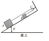 【已刪除】三、如圖三所示,A、B 兩物體質量分別為 20 kg 與 10 kg 繫於繞過滑輪 C 之繩索兩端, 靜置於斜面上,已知兩物體與斜面之靜摩擦係數為µ = 0.25,滑輪 C 之摩擦力不計。 將斜面傾斜角θ 逐漸加大,求兩物體開始滑動時之最小θ 角為何?(25 分)