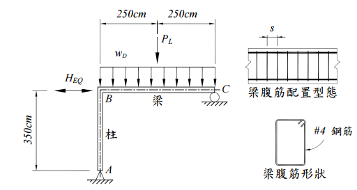 = 10,000 kgf 。此一地震力係指“使用程度"(service level)之地震力。 梁寬為 b = 40 cm ,梁之有效深度為 d = 53 cm 。柱斷面為正方形,其尺寸為 50 cm×50 cm 。鋼筋之 降 伏 應 力 為 f