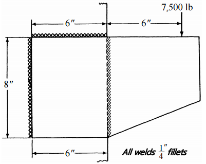 【已刪除】四、如圖所示,為一偏心之焊接板件,若焊接金屬物其降伏強度為 50k psi,圖中負載力為 一穩定之 7500 lb,試畫出受應力最大處之位置,並計算此安全係數為何?(20 分)