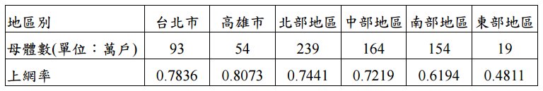【已刪除】 ⑶若依區域別分層(分為台北市、高雄市、北部地區、中部地區、南部地區、東部地 區等六層),各層的家庭上網率如下表所示。則請問採用紐曼配置下,總樣本數 及各層樣本為何?(15 分)