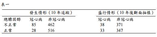 二、請計算表一中就 10 年追蹤的資料,總膽固醇不正常的人比上總膽固醇正常的人冠 心病發生的機率之相對危險比(risk ratio)和危險對比值(odds ratio)。(20 分)