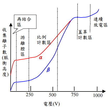 【已刪除】8. 下圖為充氣式偵檢器在不同電壓下收集到之離子數目,(a) 解釋各種工 作區形狀的特性,(b) α粒子與 β 粒子的反應為何不同?(10%)