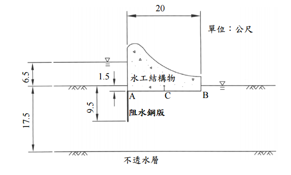cm/sec)之滲流量以及其底面 中點 C 之上揚壓力(Uplift Pressure)。以上計算以此水工結構物之單位寬度考慮之。 (10 分) [附註:務必轉繪流網於試卷上,流槽數 3 或 4 個] 20 單位:公尺 6.5 1.5 水工結構物 A C B 9.5 阻水鋼版 17.5 不透水層