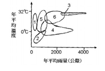 12、 右圖中(1)~(6)為六個不同生態系中的年平均溫度和雨量資料,則生態系(2)的生物相有哪些特徵? (A) 植物主要由高大闊葉樹組成 (B) 植物依春夏秋冬呈現明顯季節性變化 (C) 植被以地衣、蘚苔類以及矮小生長紀短的草本植物為主 (D) 動物生活所需的水,完全依賴食物中的水分