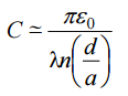 【已刪除】⑴已知兩條半徑為 a 相距為 d 的兩條平行金屬導線間的電容在 a << d 時可表為: