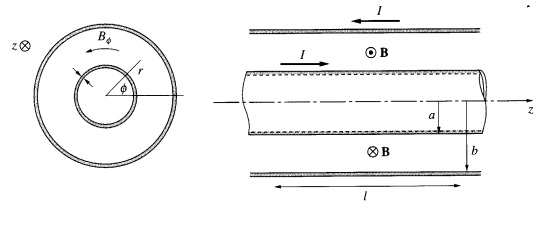 【已刪除】二、請求出如圖所示同軸電纜的單位長度電感的表示式。為簡單起見你可以假設電流只 流在 r = a 和 r = b 的兩個圓柱面上。(20 分)