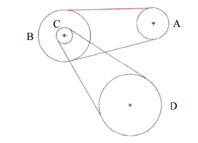 【已刪除】三、如圖所示之四帶輪組,動力由 A 輪經 B 輪及 C 輪而傳到 D 輪。A 輪直徑為 50 cm, B 輪直徑為 100 cm,C 輪直徑為 25 cm,D 輪直徑為 125 cm,當 D 輪的轉速為 120 rpm 時,則 A 輪的轉速為多少?(20 分)