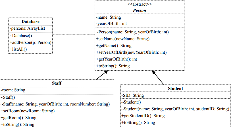 【已刪除】五、請利用下圖給定的類別架構及相關的類別介面 API 資訊,撰寫一小段 Java 應用程式 (與前述類別同一目錄),使能將一位 Staff {李台生, 1957 年生, 員工房號 R1220}及 兩位 Student {王小明, 1988 年生, 學號 B88001; 張小玉, 1989 年生, 學號 B89051}加入 到一個 Database 去,最後並列印 Database 內全部 Person 的資料(包括該 Staff 與 Student)。(20 分)