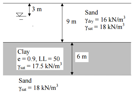 【已刪除】四、有一地層如下圖所示,該處地層之孔隙水壓呈靜水壓分佈,地下水位面位於地表下 3 m 處。該正常壓密粘土:γ