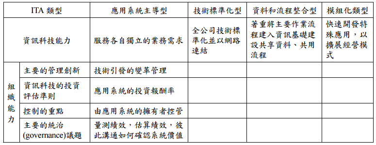 【已刪除】⑷模組化類型:開發各種可再使用的模組化程式,以便能利用資訊科技基礎建設, 快速開發出來因應特殊需求的應用系統,而得以擴展經營模式。 下表主要說明在四種不同的 ITA 類型之下,各著重怎樣的組織能力,表上已先列出 了應用系統主導型相關的組織能力,試以此為參考完成下表中空白之處。(24 分)