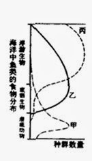 5.右图纵向表示海洋不同深度中鱼类的食物分布状况,曲线甲、乙、丙分别表示三种鱼的数量变化。下列对此图的分析,错误的是 (A) 海洋中的鱼类具有垂直分层现象 (B) 此图表明鱼类对食物的竞争状况 (C) 此图表明海洋中鱼类的捕食状况 (D) 此图表明海洋中鱼类的共生关系