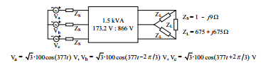 【已刪除】二、一台三相理想變壓器具有線電壓比為 173.2 V:866 V,而三相總伏安為 1.5 kVA 之 額定量,試問若如下圖所示將其之低壓側接至一組三相 Y 型連接之電壓源,而高壓 側連接至一組∆型連接之平衡三相負載後,負載所消耗之總實功(Real Power)及總 虛功(Reactive Power)各為多少瓦(W)及乏(VAR)?(25 分)
