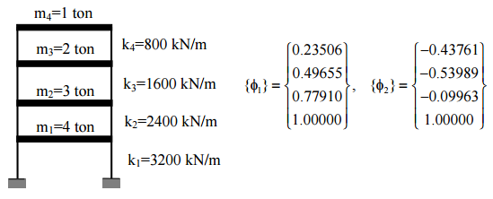 【已刪除】四、圖示之四層樓剪力屋架,圖中 mi和 ki分別為第 i 樓層之質量與總側向勁度。在雷利 阻尼(Rayleigh damping)的假設下,其第一至第三模態的阻尼比分別為 0.02、0.04 和 0.043,已知第一和第二模態的模態形狀分別為{φ1 }和{φ2 },試求第三模態的頻 率。(忽略柱的軸向變形。)(25 分)