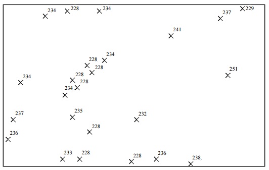 【已刪除】四、下圖為某地區測得之樣本點分布圖,數字部分為該點位置之高程,試以簡圖(不需 精確計算)說明如何應用下圖製作規則格網(grid)以及不規則三角網(triangulated irregular network, TIN)之數位地表模型的方法。(25 分)