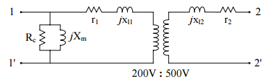 )之實際值(以Ω為單位)大小?而若此變壓器之高壓 側(2 - 2'兩端間)的電壓在連接至一複數功率大小為 1.0 p.u.、功因為 0.8 滯後的 負載時為 500V,試問在此操作條件下變壓器之電壓調整率及效率各為多少%? (30 分)