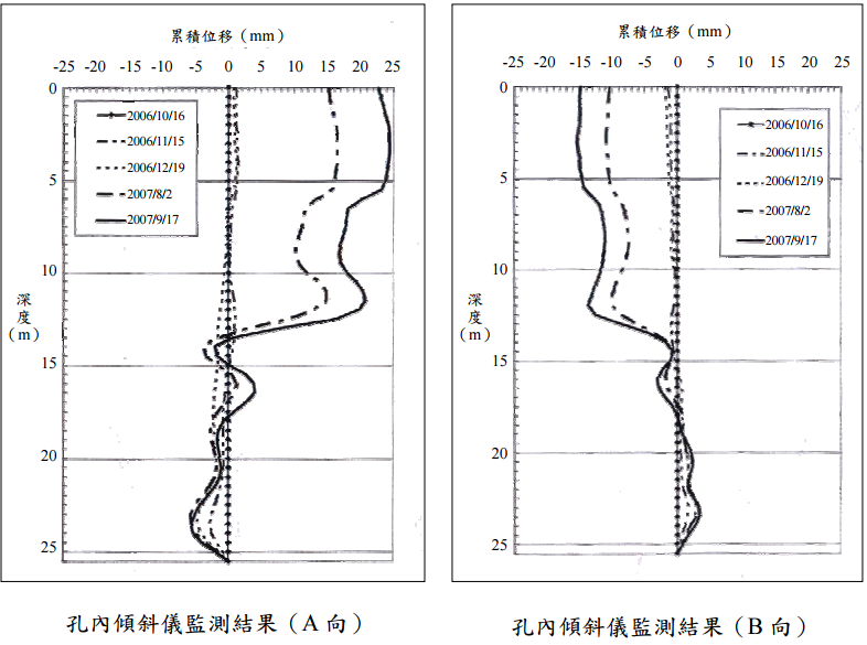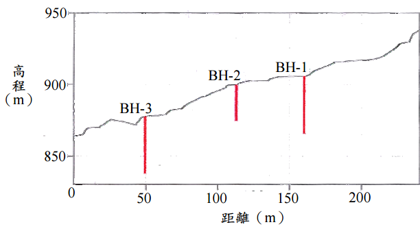 【已刪除】三、附圖為某邊坡不穩定區最具代表性的地形剖面及已完成的地質鑽探孔位置及深度示