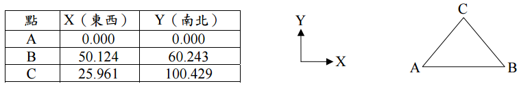 【已刪除】一、一三角形角點為 A、B、C,其平面坐標經 GPS RTK 觀測及平移後如下表(單位為公尺) 假設 RTK 測量標準偏差為 2 公分(指 X 或 Y 分量),令各坐標分量誤差不相關。 試根據上表,計算△ABC 面積之標準偏差(以平方公尺表達)。(20 分)