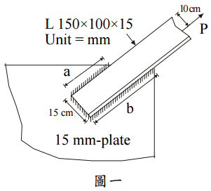 【已刪除】一、有一角鋼(L 150 mm×100 mm×15 mm)使用填角焊焊接在一塊連接板(厚度 1.5 cm) 上,使用此角鋼之材料強度,試依據工作應力法(ASD)設計焊接長度a 及b。(25 分) 鋼材之降伏強度 F