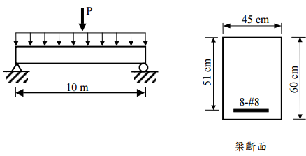 【已刪除】二、圖示為一跨距 10 m 之簡支梁。此梁將承載含自重之靜載重 1.0 tf/m 與活載重 P=10 tf。 試計算梁跨距中點因活載重作用時之瞬時撓度。ㄧ根#8 鋼筋截面積為 5.07 cm