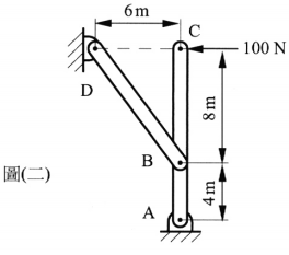 15.如圖(二)所示,不考慮各桿件質量,且各接點均無任何摩擦阻力,於C點施以100N之力, 此時A點之作用力大小爲多少?