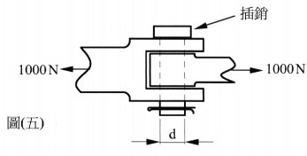 19.如圖(五)所示,一聯結器之兩桿件用插銷連結,並承受1000 N之拉力作用,插銷之容許 剪應力爲10 MPa,則插銷之直徑d至少應爲多少?