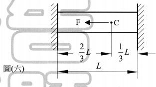20.如圖(六)所示,長度爲L之圓棒,其斷面積爲A,彈性模數爲E,圓棒兩端固定。C點 若受到向左之軸向力F,則圓棒C點之位移爲多少?