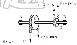 21.如圖(七)所示,圓桿AB之兩端各由軸承支撐,其直徑爲5 cm,並於C處與D處各有 直徑爲80 cm與40 cm之皮帶輪,其中D輪爲驅動輪,則於C輪上皮帶之張力F1爲多少?