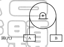 24.如BI(九)所示,荷重A的質量爲8 kg,荷重B的質量爲12 kg。若滑輪與軸承之間無任何 摩擦阻力,且滑輪與繩索的質量忽略不計’則繩索的張力爲多少?(重力加速度爲9.8m/SeC2 )