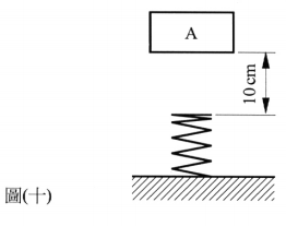 25.如圖(十)所示,有一質量200 kg之A物體#自由落下到$彈簧上&彈簧之彈簧常數爲 98kN/m。若不考慮彈簧質量,且空氣阻力的作用可忽略不計,則彈簧之最大壓縮距離爲 多少?