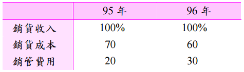 【已刪除】五、下表為宜蘭公司 95 年、96 年度之銷貨收入、銷貨成本及銷管費用佔各該年度銷貨 收入百分比之資料: