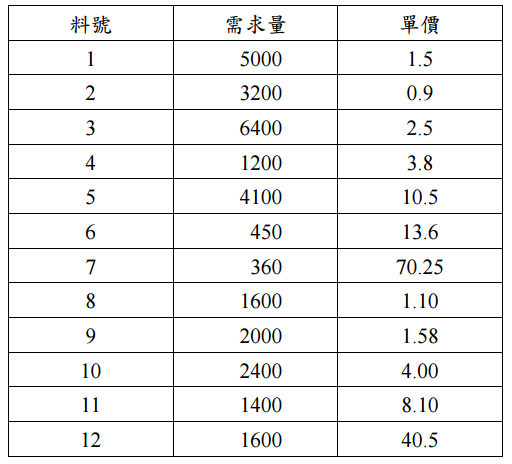 【已刪除】五、某交通單位欲將其目前所使用 12 項材料進行 ABC 分類,已知各項材料每年的需求 如下表所示,試為其分類,並說明所採之分類準則。(20 分)