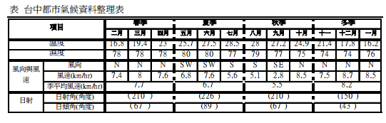 【已刪除】⑷圖面比例尺自行設定。 三、其他注意事項: ⑴基地住宅區之建蔽率:60%,容積率:180%。 ⑵設計內容需滿足現行所有法令規定。 ⑶設計必需充分利用通風與採光的自然條件。表為台中都市全年氣候資料,詳請參 考運用。