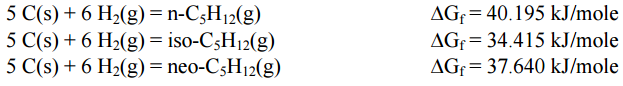 )各別的 Gibbs free energy of formation 如下列所示。在溫度 400 K,壓力 1 bar 下,計算三種戊 烷的混合物,在平衡時的各別莫耳分率(mole fraction)。平衡常數(K)公式 ∆G = -RT ln K,其中氣體常數 R = 8.314 J/mole-K。(20 分)