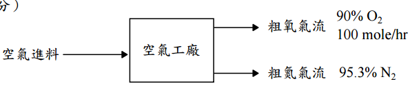 【已刪除】三、空氣工廠分離氣體,示意圖如下,如欲生產每小時 100 mole,90%的粗氧氣供工業用, 計算需要的空氣進料流量(mole/hr)、粗氧氣流的成分和粗氮氣流量(mole/hr)。 (20 分)