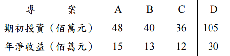 【已刪除】三、亞太物流公司明年有新臺幣一億元可用於新的管理軟體開發,下表為四項可行開發 方案的期初投資額、每年淨收益,而預估專案壽命皆為 10 年、報酬率 15%,請協 助亞太公司選出應進行開發的專案或其組合。(30 分)
