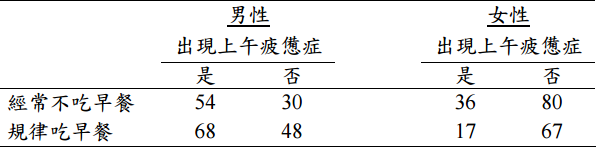【已刪除】⑴根據此數據,請計算經常不吃早餐者出現上午疲憊症的勝算比(odds ratio)。 (5 分)