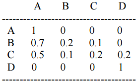 【已刪除】四、電信公司將顧客帳單分成四種狀態:A 付清、B 延遲付款兩週、C 延遲付款一個月、 D 呆帳。依據過去幾年帳單資料得到下列轉移矩陣:
