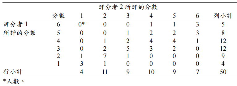 【已刪除】 ⑷如果說參加寫生比賽的學生有 50 人,為了考慮專家審查的費用,因此只用兩位專 家;又考慮到目前實作評量評分方式的趨勢以及公平性的問題,因此該校請評審用 1-6 分的 6 點計分的方式來進行評審,得到下列的結果,此時可用什麼樣的方法來 計算評分者間的信度係數呢?(4 分)用這個方法所得到的結果為何?(4 分)