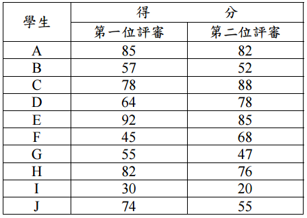 ⑶如果為了增加公平性,該校再邀請另一位專家來參與評審,結果就變成了每一位 參賽者的作品都由三位專家評過,此時可用什麼樣的方法來計算評分者間的信度 係數呢?(5 分)