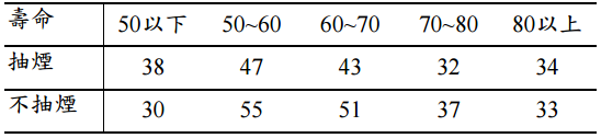 試在 α = 5% 下,檢定抽不抽煙是否與壽命的長短有關?
