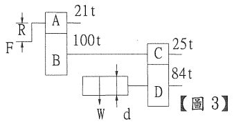 13.如【圖3】所示之起重機輪系,曲柄長R=30 cm, 捲筒直徑d=30cm,今欲吊起重量W=640 kgw之 重物時,曲柄上施力F為多少kgw? (A) 10 (B) 20 (C) 30 (D) 40