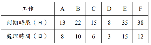 【已刪除】二、某工廠有六個工作都需經相同之設備處理,各工作到期時限(due date)與處理時間 (processing time)(包含生產整備時間)如下: