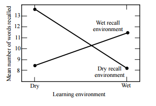 Wet recall environment)接受單字回憶測驗,結果顯示如下圖,請說明此一研究的主