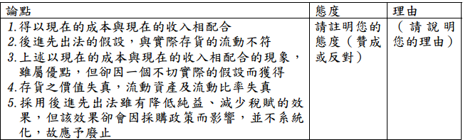 【已刪除】 ⑶有一派人說,採用後進先出法的優點,在得以現在的成本與現在的收入相配合, 故應採用。不過,另外一派人卻說:1.後進先出法的假設,與實際存貨的流動不 符、2.上述以現在的成本與現在的收入相配合的現象,雖屬優點,但卻是基於一 個不切實際假設而獲得、3.存貨之價值失真,流動資產及流動比率失真,以及 4.採用後進先出法雖有降低純益、減少稅賦的效果,但該效果卻會因採購政策而 影響,並不系統化,故應予廢止。 (1)試以下表評論上述二派說法,判斷其立論基礎是否正確?(5 分)